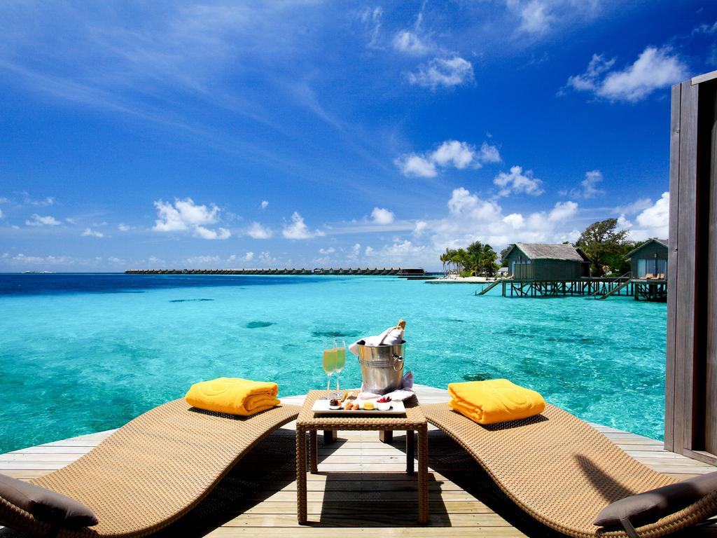 Deluxe Water Villa: Приблизително 42 кв.м, включително и откритата площ, като Ocean Front Beach Villa, построена над водата, с дървена тераса с шезлонги и директен достъп до лагуната.