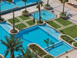 Хотелът разполага с частен плаж, открити и закрити басейни и СПА център – Spa by Clarins.